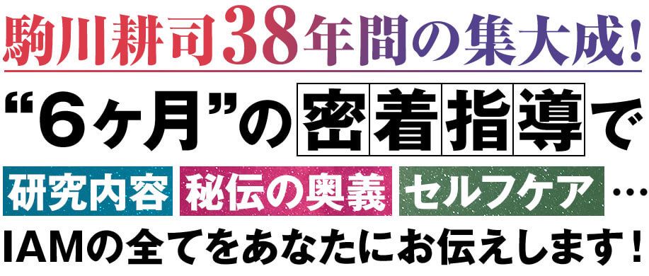 このプロジェクトでは、駒川先生が38年間の研究と25万人もの臨床の末切り開いた「IAMテクニック」の全ての技術をあなたに徹底伝授。駒川先生と同じレベルまで使いこなせるようになっていただけます。