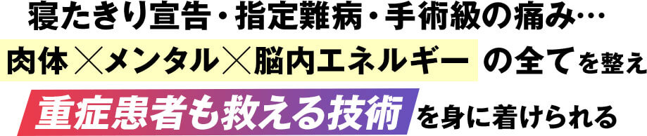 しかし、そんな時にこの治療法があれば、身体に一切負担がないやさしい方法で劇的な変化を出すことができます。しかも、肉体だけでなくメンタル・ぬおないエネルギーといった病院/通常の整体法では調整が難しい分野まで踏み込んで総合的に改善できるので、誰にも負けない唯一無二の手法を確立して、あなた自身がたくさんの人から必要とされる存在になることができます。